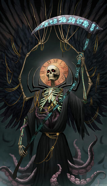 Death wanders a fine line between the realm of mortals. Tall, large, and imposing, this twelve foot tall god watches from the other side of the veil, pulling the strings only as deemed necessary. Those in near death circumstances or those that are dying are quite prone to seeing this six armed deity in their dreams.Whether through divine protection or some other reason, this good aligned death god has a few entities and forces they keep tabs on. This death god is not just the death of mortals, but of all things and every thing--as everything, does in fact, come to an end, one way or the other.